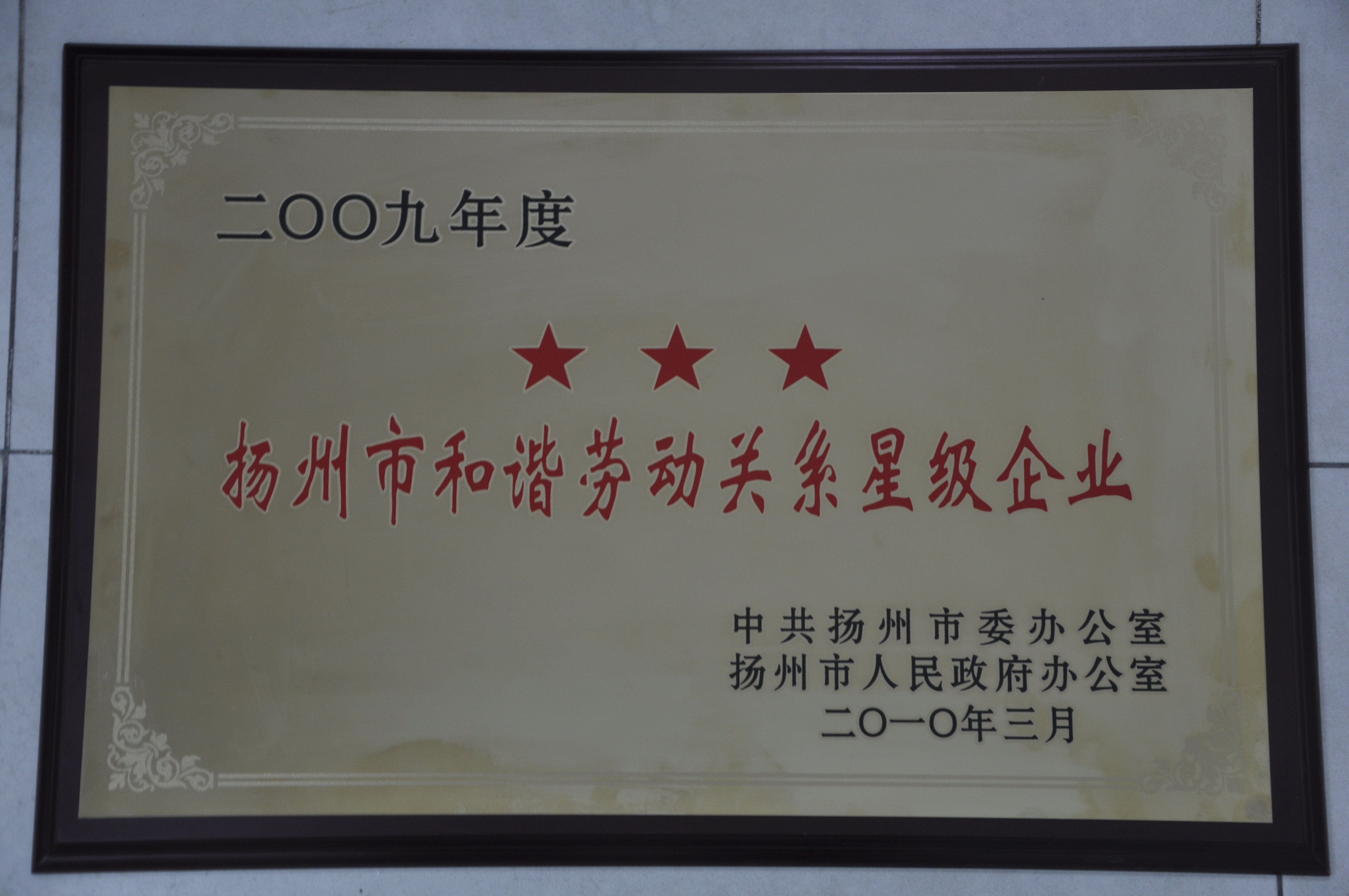 集團公司獲2009年揚州市和諧勞動關系“三星級企業”殊榮