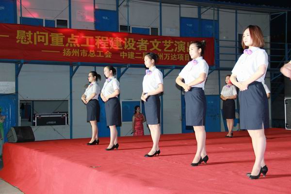5月3日晚,由揚州市總工會主辦、揚州市建設產業工會承辦的“建設者之歌”——慰問重點工程建設者文藝演出,在揚州萬達廣場項目部生活區隆重舉行。我公司參演的《七彩揚汽——員工行為規范操》得到了在場領導和工程建設者的一致好評。市總工會副主席洪慧娟,市建設產業工會主任田繼榮,市交通產業集團黨委副書記、紀委書記、工會主席王寧生等領導出席了晚會。