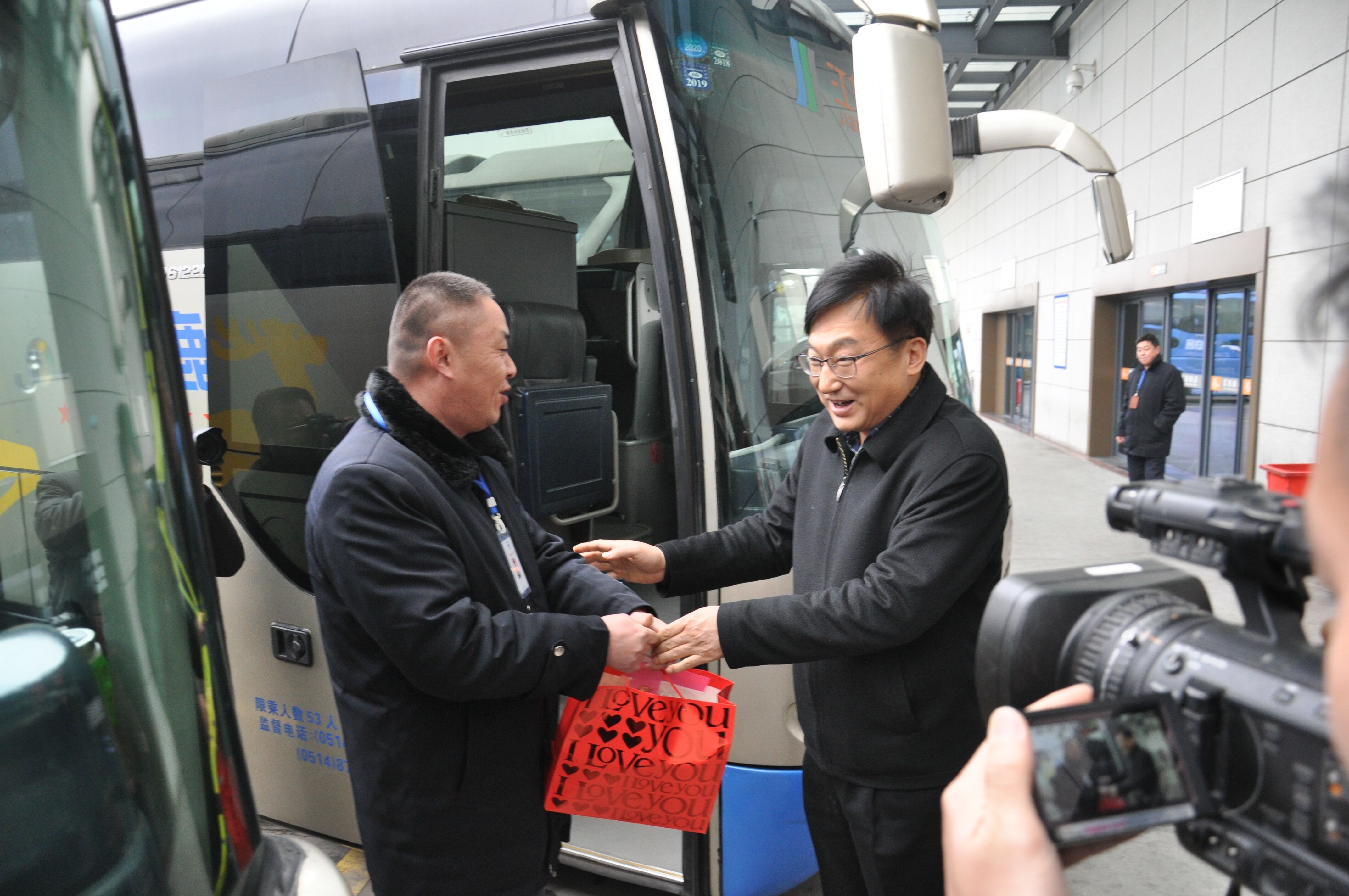 會議結束后,丁市長一行前往公交和揚汽的場站,對一線駕駛服務人員進行慰問。丁市長還登上揚汽的大巴車,給旅客送上了象征吉祥如意的桔子,祝福大家一路平安,闔家幸福。