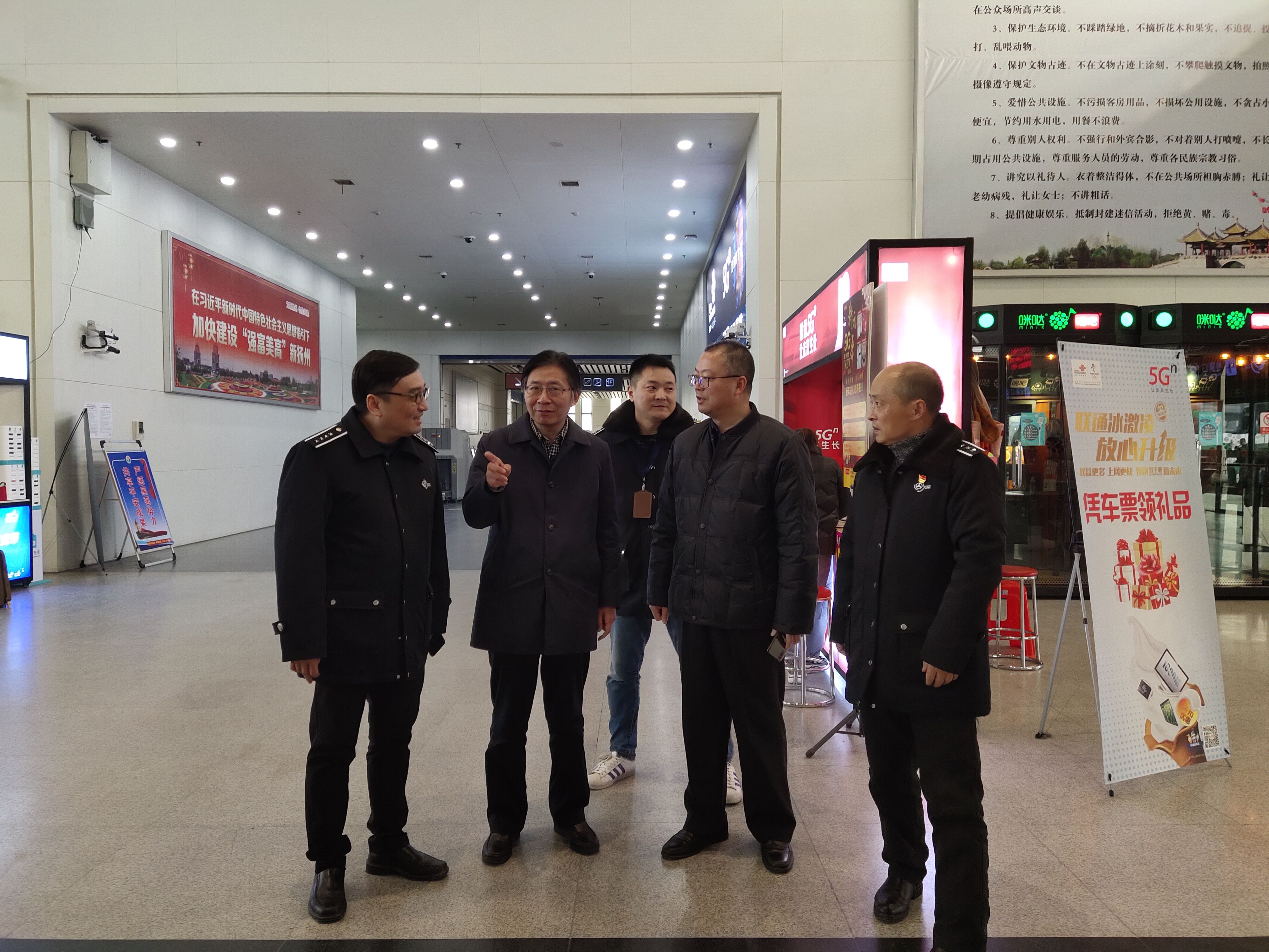 1月13日,進入春運工作第四天,下午,市交通運輸局局長徐斌,市運管處主任居遠山等一行人,突擊檢查了揚州汽車站春運期間的安全生產工作。揚汽集團總經理助理、揚州站站長繆斌陪同檢查。