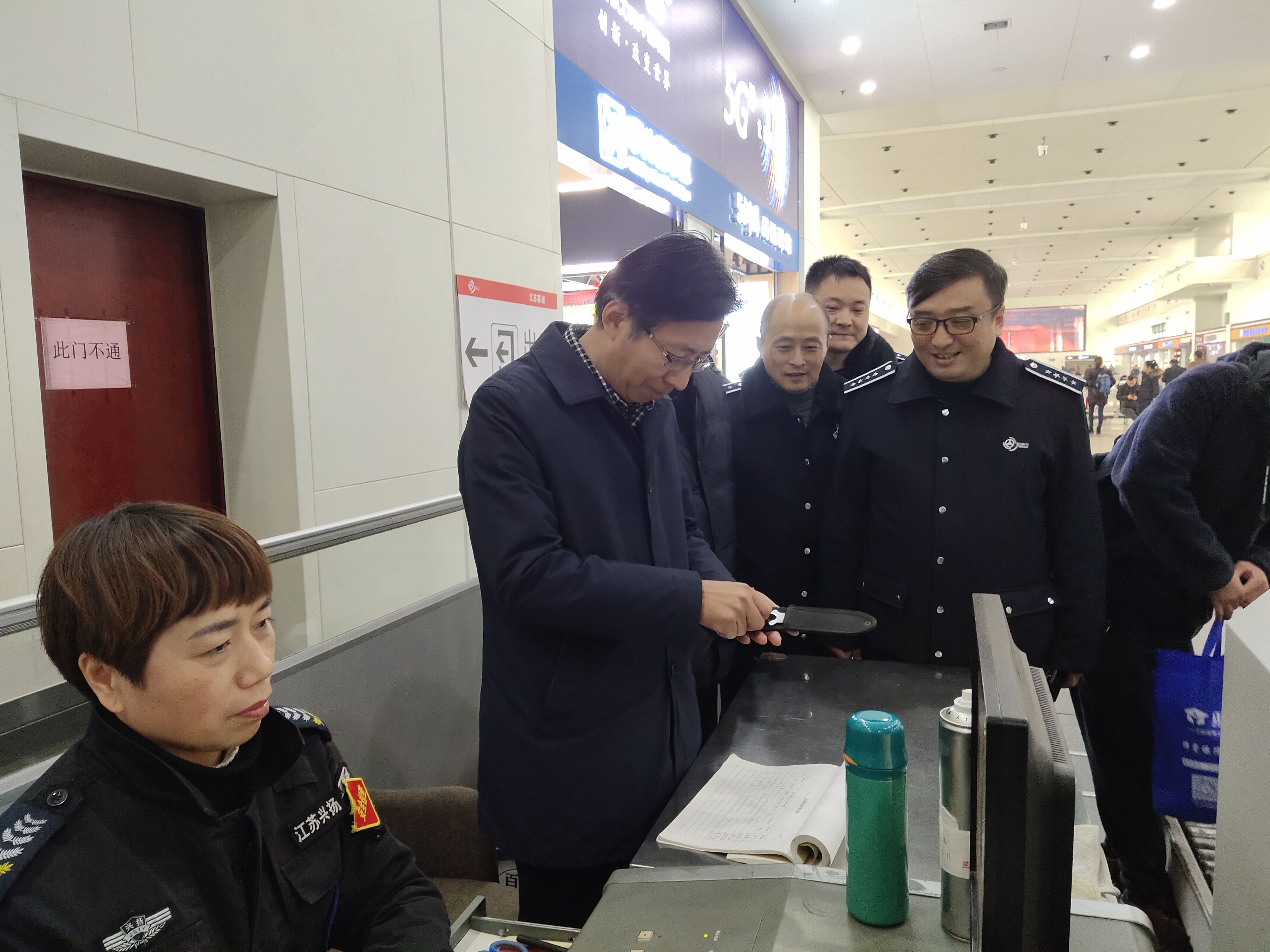 在安檢現場,徐斌局長查看了安檢工作人員春運期間查獲的管制刀具,他強調要時刻繃緊安全這根弦,絲毫不能懈怠,堅決杜絕危禁品上車;在候車大廳,他詳細了解了旅客安全帶的系戴情況,對揚州站嚴格執行“三不進站,六不出站”表示了肯定。春節在即,徐斌局長要求,在抓好安全生產工作的同時,要不斷提升服務質量,充分展示好政府的“窗口”形象,展示出交通人守初心、敢擔當、勇于奉獻的精神面貌。