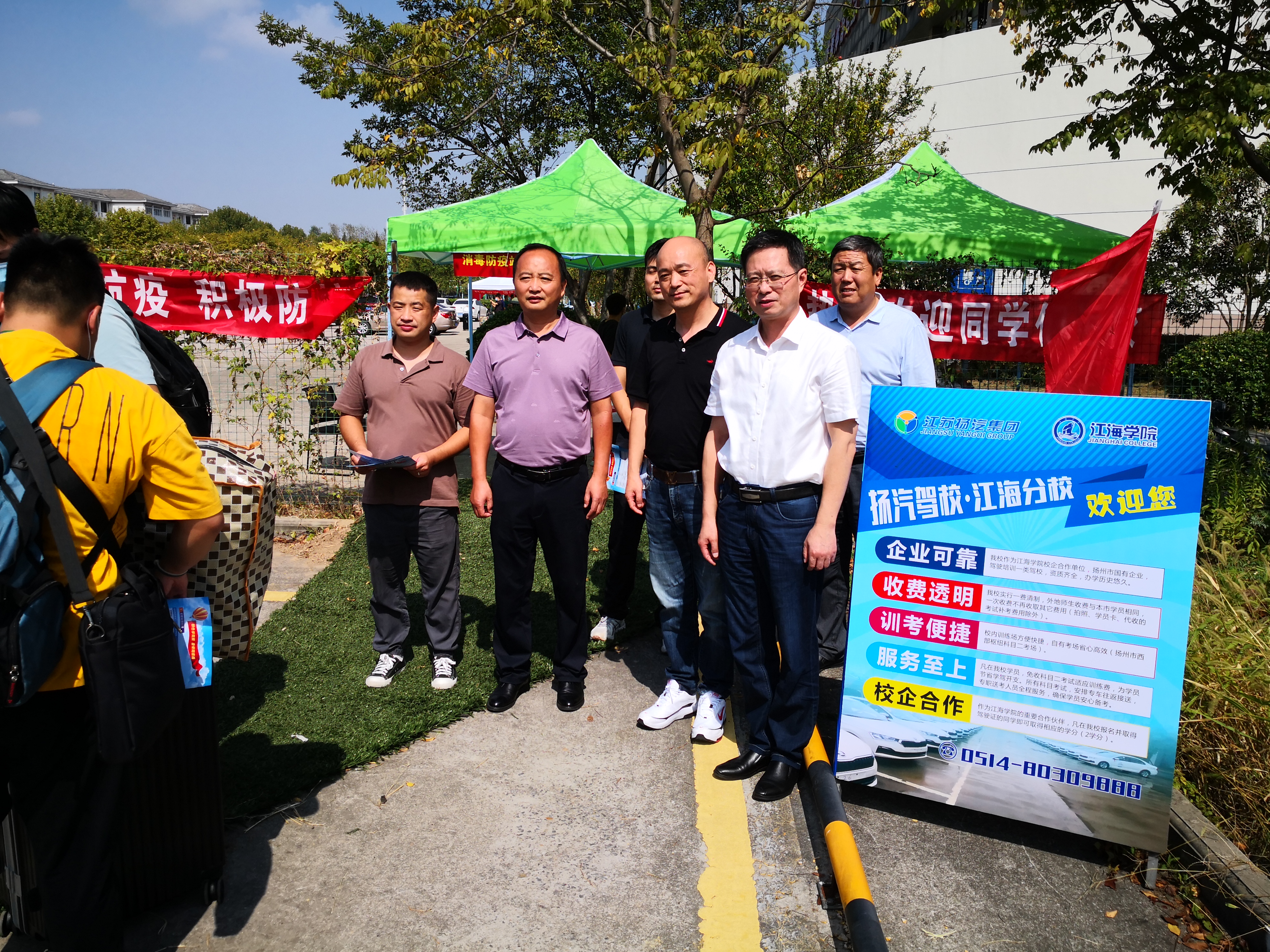 在江海學(xué)院咨詢點(diǎn),揚(yáng)汽駕校在校內(nèi)搭建了咨詢臺、遮陽棚等設(shè)施,并制作宣傳海報(bào)、宣傳冊等。現(xiàn)場工作人員嚴(yán)格按照學(xué)校疫情防控工作部署要求,落實(shí)落細(xì)各項(xiàng)措施,有序引導(dǎo)學(xué)生通過訓(xùn)練場內(nèi)設(shè)置的專用通道前往學(xué)校報(bào)到點(diǎn),并協(xié)助學(xué)校工作人員查驗(yàn)健康碼、測量體溫等,同時(shí)向?qū)W生及家長分發(fā)招生宣傳冊,詳細(xì)講解揚(yáng)汽駕校收費(fèi)透明、訓(xùn)考便捷、服務(wù)至上等優(yōu)勢,耐心解答學(xué)生及家長的學(xué)駕問題,為下一步更好地開展報(bào)名培訓(xùn)工作奠定了良好的基礎(chǔ)。