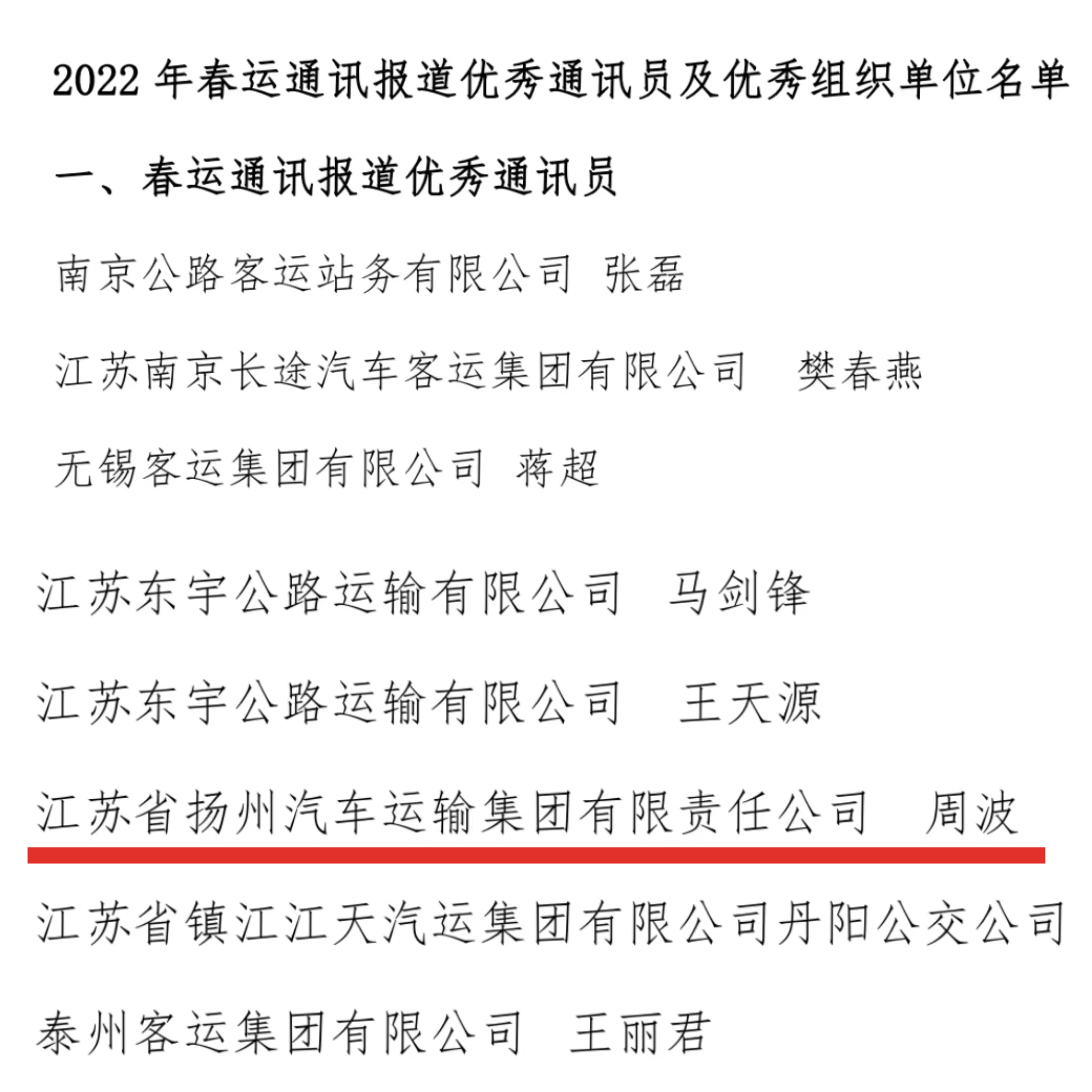 近日,江蘇省交通物流協(xié)會汽車運輸分會下發(fā)《關(guān)于表彰 2022、2023 年春運報道“優(yōu)秀通訊員”、“優(yōu)秀組織獎”的決定》,集團周波獲評“2022 年、2023年春運通訊報道優(yōu)秀通訊員”,陳思宇獲評“2023 年春運通訊報道優(yōu)秀通訊員”。