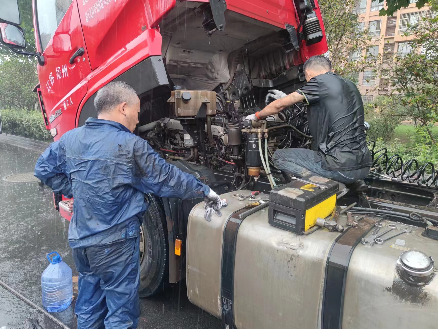 修理工們到達南京后立馬分工合作,由于在路邊救援多有不便,加上天氣變化惡劣,為了保證貨車能及時趕往工地,救援人員不畏艱險、不懼風雨堅持搶修。即使衣服已經全部濕透,油泥已經掛滿全身,但大家毫無半點怨言,專心投入在搶修任務中。直到順利換好變速箱三件套,車輛可以正常行駛。貨車公司的負責人在得知貨車安全上路后,也被大家這種不畏艱險的精神所感動,當場表示要與修理廠簽訂12輛半掛貨車的定保合同,同時他還激動的說到:“只有把車輛交給你們這樣認真負責,肯為車主著想的修理廠,才能放心!”