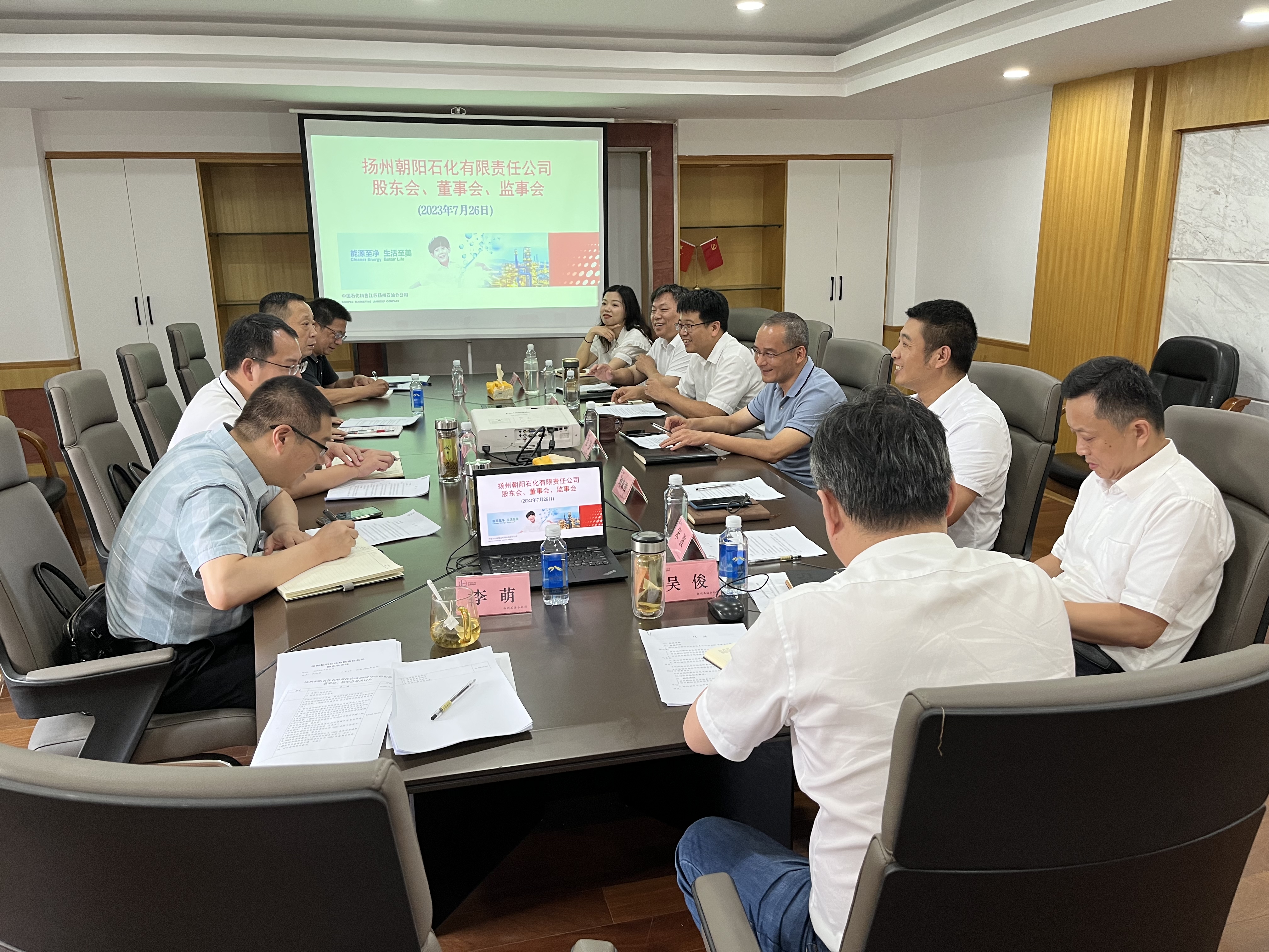 7月26日,揚(yáng)州朝陽石化有限責(zé)任公司及其股東單位中石化江蘇揚(yáng)州石油分公司、揚(yáng)汽集團(tuán)在中石化江蘇揚(yáng)州石油分公司313會(huì)議室召開了揚(yáng)州朝陽石化有限責(zé)任公司2023年度股東會(huì)、董事會(huì)、監(jiān)事會(huì)。其股東方代表市交通產(chǎn)業(yè)集團(tuán)副總經(jīng)理、揚(yáng)汽集團(tuán)黨委書記、董事長(zhǎng)龔宇峰,揚(yáng)汽集團(tuán)副總經(jīng)理孫華出席會(huì)議。